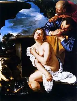 Artemisia Gentileschi produced her first portrayal in 1610 when she was seventeen years old.[14]: 298 The painting is considered one of the earliest to portray Susanna as clearly distressed at being watched; according to Christiansen and Mann, "no other artist had interpreted the psychological dimension" of the story.[14]: 296 According to Mary Garrard, the painting used an explicitly feminine point of view[15] and provided an "unorthodox interpretation" of the scene, calling out Garrard's surprise that until she did so in 1982, no attention had been paid by art scholars to that unorthodoxy.[11]: 147–148 Garrard notes the similarity in composition to that of the 1590 Annibale Carracci but points out the vastly different feeling; Carracci's Susanna appears to be "sexually available and responsive" while Gentileschi's is clearly distressed.[11]: 148 Carracci's lushly planted garden is replaced by a stark stone bench and balustrade.[11]: 148–149 The painting communicates Susanna's unhappiness rather than focussing on the sexual pleasure the elders are coercing her for.[11]: 149 It is unique in that the two elders are shown whispering to one another, emphasizing the plot between them.[11]: 163 Garrard wrote that "in no other version of the subject known to me are the Elders shown whispering to one another".[18]