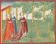 Many other images on catacomb walls or marble sarcophagi depict Susanna standing between the two Elders or between the two trees that represent their duplicity. A woman between two trees might also be a conflation of Susanna and a deceased Christian woman in the garden of Paradise: Susanna was praised by the early Church as an embodiment of modesty, innocence, and marital virtue, and she could have appropriately decorated the tomb of any Christian woman of good character.[7]