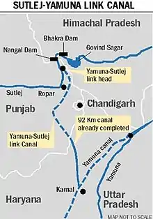 Satluj Yamuna Link Canal or SYL as it is popularly known, is an under-construction 214-kilometer (133 mi) long canal in India to connect the Sutlej and Yamuna rivers.[2] However, the proposal met obstacles[3] and was referred to the Supreme Court of India.[2] It was defined as river water sharing between the states of Punjab and Haryana.