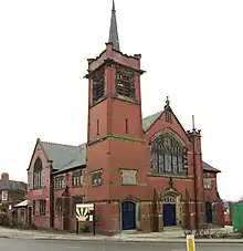 The building was designed by the architects George Baines FRIBA and R. Palmer Baines and opened on 4 April 1906 by Mrs. Alliott of Nottingham and Rev. Clifton Somervell.[4] It was faced externally with red bricks, with dressings and tracery of Derbyshire stone. The seating was circular radiating from the pulpit as a centre, and accommodation was provided for 830 persons. The contractor was Mr. Greenwood of Mansfield.