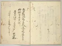 - Gon-hōri-bon (権祝本): Written in 1472 (Bunmei 4) by Sōjun (宗詢), a monk from the Ina district of Shinano who transcribed a two-volume handwritten copy of the text made by a monk of Shicchi-in Temple in Mount Kōya, Jōen (盛円), who was a native of Suwa.[40][43][19][44] This particular manuscript came into the possession of the Yajima clan, who served as gon-hōri (one of the five assistant priests to the ōhōri) of the Suwa Kamisha. From the Yajima, the Gon-hōri-bon passed into the ownership of the Moriya clan (another priestly family of the Suwa Kamisha) in 1847.[40][43]