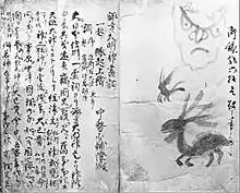 At some point before the early to mid-19th century, certain pages in the latter half of the Matsuri section have been rebound in incorrect order. Copies of the Gon-hōri manuscript text from the 1830s onwards and printed editions based on them reflect this error.[45][46] - Jinchō-bon (神長本): A copy of the Gon-hōri-bon made during the Muromachi period.[40] The Jinchō manuscript notably features a different, more detailed version of the Matsuri portion of the text, suggesting that this section was edited for use by the Moriya jinchōkan,[40] the priest responsible for overseeing the religious rites of the Suwa Kamisha.[47] The title is given in this copy as Suwa Daimyōjin Go-engi Shidai (諏訪大明神御縁起次第).[40][48]