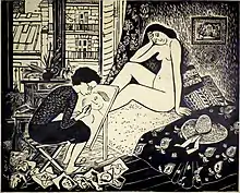 By the time of her death, she had had some eight solo exhibitions in Paris,[4] was a founder-member of the Society of Engravers known as Pointe et Burin Paris[5] and had showed regularly at the Fondation Taylor. In London her work has been shown posthumously at the Abbott and Holder gallery.[6] In August 2018, the Leicester Print Workshop mounted an exhibition of Balkanyi's work.[7] Public collections holding her work include those of the City of Paris (Un arrêt d’autobus), the Musée du Louvre Print Collection (Deux vieilles femmes[8] , Lourmarin[9], Salon de couture[10],[11] Vue de Lourmarin[12] ), the Zurich Kunsthaus, the Musée de Beaux-Arts de Belfort, the Victoria and Albert Museum, and The British Museum (La Rotisserie). Her images have been published in: Acceuil de Paris, Le Trait, La Pointe et Burin and La Gravure Originale. Balkanyi illustrated a number of books including Francis Ambiére’s Le Bon Marché[13] and Brussac Philippe and Pierre Mac Orlan’s La Légion Étrangère[14] .