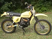 The initial 1977 PE250B proved rugged, well made and docile. The engine was effectively the 5-speed RM series motocross engine, with altered gearing, porting and a heavier flywheel, which produced only 28HP but had broader power and outstanding torque. This proved highly competitive and popular in all countries.[9][10][11]
