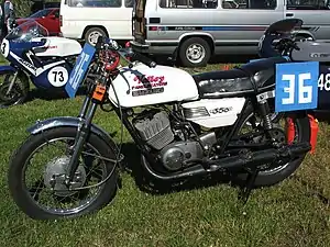 The Suzuki T350, also known as the Suzuki Rebel is a 315 cc (19.2 cu in), two-stroke, twin-cylinder motorcycle produced by the Japanese Suzuki company between 1969 and 1972. The model was based T305 and used an enlarged version of the T305 engine, which itself was an enlargement of the T20 unit. It was the fastest production 350 at the time.[3] In 1972 a T350 was overall winner of the Australian Castrol Six Hour Production race at Amaroo Park but was subsequently disqualified but the same bike won the 500cc class in 1973.[4] The model was dropped when the T380 triple was introduced in 1972.