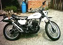 The Suzuki TS series is a family of two-stroke, dual-sport motorcycles made by Suzuki since 1969. The series was the first Suzuki trail bikes sold on the mass market. Most of the TS line had an air-cooled engine and most models were introduced alongside the closely related TM (Motocross) or TC (trail) models, TF (farm) and also the DS (for Dirt Sport, which had no turn signals, and simplified lighting) which in most cases shared engine and chassis designs. Suzuki's first mass market motocross bike, the TM400 Cyclone, was introduced in 1971 and was based on the TS that first sold in 1969. A TS185ER model was available in a few countries.[3]
