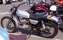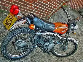 A factory race kit was available for the TS90 which consisted of an expansion chamber, light piston and rings, carburetor, and harder (colder range) plug and head which increased the size to 100 cc (6.1 cu in). In the North American market a 175cc race kit was available for the TS185. The 175 size was to match an established class. It consisted of an expansion chamber, new cylinder and head, piston, thin rings, larger carburetor, and much lower gearing. Different gearing was available for most models. The TF model (Mud Bug) was developed in the early 1970s and sold mainly in New Zealand and Australia.[5] The TF series was made in three sizes; 100 cc, 125 cc, and 185 cc engines. These bikes were based on the ER range. The TF125 is still in production. It has left-and-right side stands with large bases, a large rear carrier, headlight and lever protection, a single seat, bash plate, large mud flaps and knobby tyres.[6][7][8]