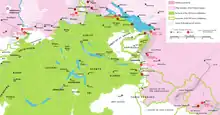 In the empire, Frederick faced the opposition of the Bavarian Wittelsbach dynasty and of his cousin Sigismund, who was duke in Tyrol, Vorarlberg, and Further Austria then. Sigismund had been in conflict with the Swiss Confederacy, too. When he had been banned by Pope Pius II in a conflict over the nomination of a bishop in Tyrol, the Swiss had annexed the formerly Habsburg territories of the Thurgau. In 1468, Sigismund clashed with the Swiss in the War of Waldshut, which he could end without significant territorial losses only by paying a large ransom, which he financed by pawning territories in the Sundgau and the Alsace to Charles the Bold of Burgundy in 1469.[4] Charles did not, however, help Sigismund against the Swiss, and so Sigismund bought back the territories in 1474 and concluded a peace treaty with the Confederacy, the Ewige Richtung, although the emperor never recognized it.[3] In the following Burgundy Wars, the Swiss and Sigismund both fought against Charles the Bold.