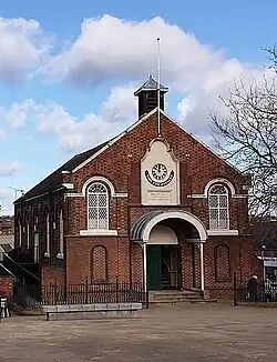 A clock, donated Sir Henry William Des Voeux, 3rd Baronet of Caldwell Hall,[5] was installed under the brick arch. As des Vouex had been involved in a lengthy and bitter lawsuit in 1865, when he lost the case but became convinced time would prove him correct, he requested that the motto "time the avenger" be inscribed beneath the clock.[6] In the 19th century, the building served as a market hall, while also accommodating petty session hearings one day a month.[7][8] An open loggia, with iron columns and a glazed roof, was later added to the east side to provide additional space for market stalls.[1] The building also became a significant venue for public meetings: in February 1902, a public inquiry was held there relating to the proposed Burton and Ashby Light Railway.[9]
