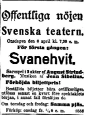 Swanwhite (Swedish: Svanevit), JS 189, is incidental music for orchestra by Jean Sibelius for a play of the same name by August Strindberg. It consists of a horn call and thirteen other movements. Sibelius completed it in 1908 and conducted the first performance at Helsinki's Swedish Theatre on 8 April 1908. In 1909, Sibelius drew from it a suite in seven movements, Op. 54.[1]
