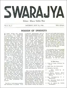 Swarajya was launched as a weekly magazine in 1956 by journalist Khasa Subba Rao, under the patronage of C. Rajagopalachari, a prominent independence activist and one of the founders of the Swatantra Party.[18][19]