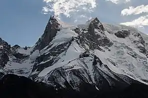 On 7 June 1993, an expedition from Sweden made the first undisputed ascent of the peak from south face. The summit team comprised Birger Andrén, Ingela Nilsson, and Ake Nilsson. They ascended a rock ridge on the eastern side of the south face, leading to the easy east-southeast ridge.[4]