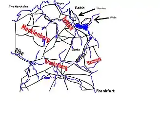 Ueckermünde and Barth (to the west of Stralsund) were also taken without incident.[58] Wolgast was besieged, and although the garrison gave up the city to the Swedes they held out in the citadel of the city.[58] This garrison hung onto the citadel until 16 August.[58] Treptow[57] was also taken.