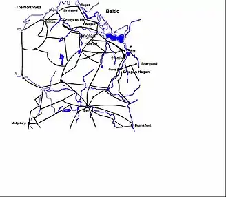 Meanwhile, stationed at Pasua and Elbing (to the far east), Oxenstierna was seeking to move towards the king. The cities that were critical to establishing a land route between the two armies was Kolberg (occupied by the Imperials) and Cammin. Knyphausen and Oxenstierna were entrusted with the task of establishing a land route between Prussia and Swedish occupied Pomerania.[61] Meanwhile, being August as it was, the king was contemplating the establishment of winter quarters.[61] However, the Administrator of Magdeburg, Christian William declared in favor of the Swedish, drove out the Imperial garrison and called the Swedes to aid the city. This was done without the king's prior knowledge, and there were many objects which the king deemed to be of higher importance than the city of Magdeburg. It is not likely the king would have encouraged such a move if he had been consulted about it. The king still wanted to march to the Elbe,[61] take possession of the duchy of Mecklenburg and engage in negotiations with Hamburg and Lübeck. Magdeburg was much too far away, and there were large contingents of Imperial troops between the Swedish army and Magdeburg. However, the king sent a colonel, Dietrich von Falkenberg, to the city and ordered him to bring the city into the highest level of defense for an anticipated siege by the Imperials.[62]