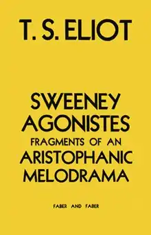 Sweeney Agonistes by T. S. Eliot was his first attempt at writing a verse drama although he was unable to complete the piece. In 1926 and 1927 he separately published two scenes from this attempt and then collected them in 1932 in a small book under the title Sweeney Agonistes: Fragments of an Aristophanic Melodrama. The scenes are frequently performed together as a one-act play.[1] Sweeney Agonistes is currently available in print in Eliot's Collected Poems: 1909–1962 listed under his "Unfinished Poems" with the "Fragments of an Aristophanic Melodrama" part of the play's original title removed. The scenes are separately titled "Fragment of a Prologue" and "Fragment of an Agon".