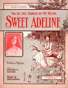"(You're the Flower of My Heart,) Sweet Adeline" is a ballad best known as a barbershop standard. It was first published in 1903, with lyrics by Richard Husch Gerard to music by Harry Armstrong, from a tune he had written in 1896 at the age of 18. According to a 1928 newspaper story, the lyrics were inspired "by a girl who worked at the music counter of a New York department store."[1] After failing to find a publisher with the initial title, "You're the Flower of My Heart, Sweet Rosalie", according to a story the two decided a new title was in order and were inspired by a poster advertising the farewell tour of opera singer Adelina Patti.[2] It did not become a hit until it was performed in 1904 by the group The Haydn Quartet. The Haydn Quartet's version was #1 for 10 weeks in 1904, and the Peerless Quartet also hit #1 with their version in 1904, for three weeks, according to Joel Whitburn's Pop Memories.