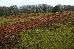 It is also the site of a deserted medieval settlement, which has been designated as a scheduled monument.[7] [8] It has been added to the Heritage at Risk Register because of the vulnerability to plant growth.[9]