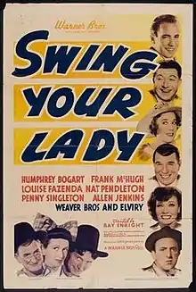 Swing Your Lady is a 1938 American country musical comedy film directed by Ray Enright, starring Humphrey Bogart, Frank McHugh, and Louise Fazenda. Ronald Reagan is also in the cast in one of his early roles. Daniel Boone Savage, a professional wrestler, made his film debut in this feature. Nat Pendleton was a former Olympic and professional wrestler.[1] In 1938, Brunette singer Penny Singleton was about to turn blonde and embark on a long, hugely successful career playing the iconic comic strip character Blondie in a series of 28 films and a popular radio show.
