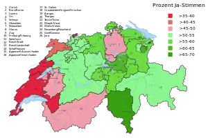 Results of the initiative, in the twenty-six cantons of Switzerland. It shows differences between linguistic regions (German-French: +10.6%; German-Italian: -16.0%; French-Italian: -26.6%) as well as between countryside and cities (-9.9%).[2]
