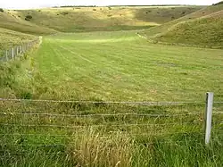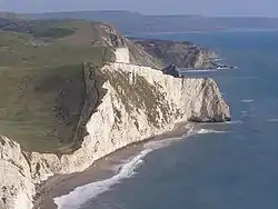 The cliffs of Swyre Head, Lulworth, are of chalk and are steep, with grassland and a footpath above. The footpath runs close to the cliff edge and is steeply undulating. Despite the steepness, it is popular for walks[1][2] and the scenery is spectacular.[3][4][5]