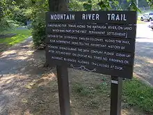 The 2-mile-loop (3 km), graveled Mountain River Trail follows the partially wooded south bank of the Sycamore Shoals of the Watauga River. Interpretive signs along the trail explain the various historical events that occurred at Sycamore Shoals.