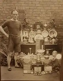 ![]() Beaumont with his athletics trophies | |||