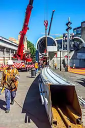 The monorail was demolished in 2013.[13] Sixty steel beams were recycled to build a temporary bridge to take Brookhollow Avenue over Norwest station during its construction between 2014 and 2017.[38][39] The temporary bridge allowed the station to be dug underneath Brookhollow Avenue, allowing the road to be closed for only a few months instead of three years as originally proposed. The bridge was dismantled in 2017 as the final station structure was being built.