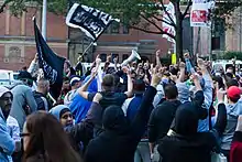 The crowd then moved to Hyde Park, where around 300 people had gathered.[3] Further clashes erupted as police used capsicum spray on protesters who at times threw bottles at police.[4] Protesters chanted "Down, down USA"[1] and carried Sunni Islamist flags and signs saying, "Behead all those who insult the prophet", "Our dead are in paradise, your dead are in hell", "Shariah will dominate the world", and "Obama Obama, we love Osama" and threw bottles and objects retrieved from construction sites at police officers. The police responded by spraying capsicum spray into the crowd.[5][6][7][8][9][10] Six police officers were injured of which two were hospitalized.[11]