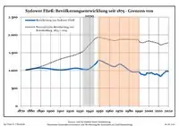 Development of population since 1875 within the current boundaries (Blue line: Population; Dotted line: Comparison to population development of Brandenburg state; Grey background: Time of Nazi rule; Red background: Time of communist rule)