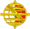 The armillary sphere was initially the personal badge of the future king Manuel I of Portugal, still when he was duke of Beja and great master of the Order of Christ. It became a national symbol when Manuel become king of Portugal, being associated with the Portuguese Discoveries and specially used to represent the Portuguese Empire. The coat of arms of Portugal adopted in 1911 has the armillary sphere as one of its main elements. |