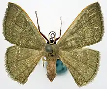 Its wingspan is about 2 cm.[3] The adult has dull olive-green wings with faint transverse fasciations. In the hindwing, a discal mark consists or a centrally broken fine white bar.[4]