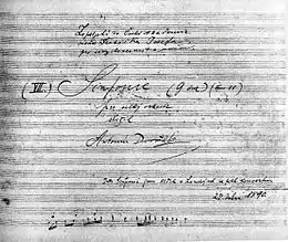 Dvořák had the London firm of Vincent Novello publish the symphony in 1890, because he had disagreements with his regular publisher Fritz Simrock, who was more interested in shorter works as moneymakers.[1][2] Simrock wanted to publish the movement titles and the composer's name in German, which Dvořák refused as a "proud Bohemian".[1] Because of the country of its first publication, this symphony has occasionally been known as the "English" symphony,[4][5][6][7] though "it would be more correct to call it the 'Czech', at least in comparison with its predecessor in D minor which was modelled more on Brahms."[7]