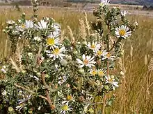 - S. falcatum var. falcatum, cespitose with up to ten stems from caudices,[6] and known commonly as white prairie aster, western heath aster, creeping white prairie aster, falcate aster, and little grey aster.[12]