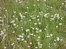 The flower heads have 15–35 usually white ray florets, sometimes blue or pink, that are typically 18–30 millimeters (3⁄4–1+1⁄8 inches) long. These surround a center of roughly the same number of disk florets that start as yellow and become brown with age.[6]