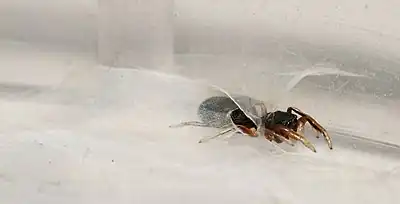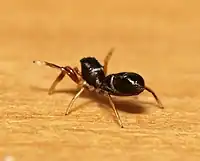 These spiders are virtually indistinguishable from ants, even for humans looking at them rather closely. They move rapidly like an ant, and even raise their second pair of legs like an ant's antennae. Hand-raised tits that had never come in contact with ants ate spiders of this species readily. However, after their first encounters with real ants, and the nauseating effect of their formic acid, they refrained from eating S. venator.[1]