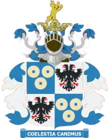 Escutcheon: Quarterly 1st & 4th Azure three millstones Proper 2nd & 3rd Argent an eagle displayed with two heads Sable beaked and legged Gules.