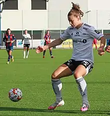 Until 2012 she played for Eik-Tønsberg.[2] Skinnes Hansen played in the top series for the Norway first division team Røa IL, who had won Toppserien the year before, starting in 2012. The title could not be defended and Røa was only fourth. In the following years, Røa commuted between 3rd and 8th place. She also played for Røa for the first time in the 2012–13 UEFA Women's Champions League, where Røa was eliminated against the later winner VfL Wolfsburg in the round of 16 after a 4–1 away defeat and a 1–1 home win. After five years with Røa, in 2017, she moved to new champions, Lillestrøm SK Kvinner. With Lillestrøm she won the Norwegian Championship in 2017 and 2018 and the Norwegian Football Cup in 2018. She played for Lillestrøm in the 2017–18 UEFA Women's Champions League, where Lillestrøm lost twice to Manchester City W.F.C. in the round of 16. In the 2018–19 UEFA Women's Champions League FC Barcelona Femení were stronger in the quarter-finals. She scored her first CL goal in the Round of 16 in a 2–0 away win over Brøndby IF.[3]