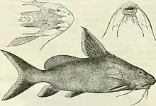 The fish has three pairs of barbels. The maxillary barbels are located on the upper jaw, and two pairs of mandibular barbels are on the lower jaw. The maxillary barbel has a narrow membrane attached near the base and is straight without any branches.[2] It extends at least as far as the base of the pectoral fin, slightly longer than the length of the head and 310 of the standard length of the body.[2] The outer pair of mandibular barbels extends just short of the pectoral girdle, about 710 of the length of the head,[2] and contains four to five branches without secondary branches.[2] The inner pair of mandibular barbels is about half as long as the outer pair, about 14 of the length of the head,[2] with two pairs of branches, without any secondary branches present.[2]