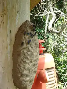 Following damage by rain to the nest, S. cyanea will seal a leak of water with their mouth-pieces. Individuals begin by suctioning the water from the wall of the nest and then finish by expelling the water to the exterior of the colony. The hole is then repaired using wood pulp.[3]
