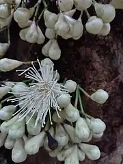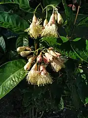 Victorian colonial botanist Ferdinand von Mueller described the bumpy satinash as Eugenia cormiflora in 1865, from a collection by John Dallachy at Dalrymple's Gap near Rockingham Bay in Queensland.[2] It was transferred to the genus Syzygium in a revision of the genus in 1983.[3] Eugenia hislopii, named by Frederick Manson Bailey in 1913, is a synonym.[4] Common names include white apple, wild apple, watergum, Cairns satinash, and bumpy satinash.[5]