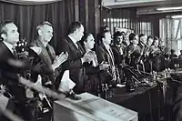 Szczecin Agreement (Polish: Porozumienie szczecińskie) was an accord, signed on August 30, 1980 at 8 a.m. at Szczecin Shipyard, between Polish authorities and the Szczecin Interfactory Strike Committee.[1] The agreement was signed by deputy prime minister Kazimierz Barcikowski, Andrzej Żabiński of the Polish Politburo, and first secretary of the Polish United Workers' Party in Szczecin, Janusz Brych, as well as Marian Jurczyk (chairman of the Strike Committee), Jurczyk's deputy Kazimierz Fischbein, and delegate of the workers, Marian Juszczuk.[2] The Agreement ended mass strikes, which took place in northern Polish city of Szczecin, in August 1980. Even though it was signed one day earlier than the Gdańsk Agreement, and turned out to be workers' success in economic and social matters, unlike in Gdańsk, the government did not promise in Szczecin to create a free, independent trades union. Nevertheless, it was one of the three historic agreements (besides Gdańsk Agreement and Jastrzębie-Zdrój Agreement), which made it possible to create Solidarity.[3] Following protesting workers in Gdańsk (see 21 demands of MKS), a list of 36 demands was also created in Szczecin. Its originally included creation of an independent union, but that demand was later scrapped. Still, the government promised not to punish those responsible for the protests, to introduce pay rises, and to create a comprehensive plan to improve delivery of food products. Furthermore, a plaque at main gate to the Shipyard was promised, to commemorate victims of the Polish 1970 protests. On Monday, September 1, 1980, all striking workers in the city returned to work.[4] The Szczecin Agreement was called "an unprecedented event in the communist camp".[1]