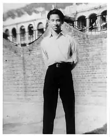 In Hong Kong, Szeto Wah studied at the Yau Ma Tei Government School and then Queen's College, and graduated from the Grantham College of Education.[5] Under his brother Szeto Ming's influence, he and his siblings joined the YWCA which had a strong left-wing leaning at the time during his student life.[6] He was contacted by the underground Communists and joined the Chinese New Democracy Youth League, the predecessor of the Communist Youth League of China, in September 1949.[7] Under the instruction of the Chinese Communist Party (CCP), Szeto founded the Hok Yau Club in 1949. Without any official affiliation, Hok Yau Club was responsible for recruiting youths for the Communist cause. Among the recruits at the time was Mo Kwan-nin, who rose to the deputy director of the New China News Agency in 1980s.[8] The club ceased to function between 1952 and 1953 after it was busted by the Hong Kong Police Special Branch. At the same time, he entered the teaching profession in 1952.[5]