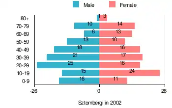 According to the 2002 Poland census, there were 249 people residing in Sztombergi village, of whom 50.2% were male and 49.8% were female. In the village, the population was spread out, with 23.3% under the age of 18, 42.2% from 18 to 44, 17.3% from 45 to 64, and 17.3% who were 65 years of age or older.[1]