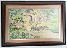 Duyên moved to Saigon in 1942, making silk and paper Đông Hồ folk prints from finger-painted woodblocks.[3][4] His work is considered as having given new dimensions to traditional thủ ấn họa hand stamp paintings.[5][6][7] He submitted some of his prints to Saigon's newspapers and his illustrations began to feature in newspapers from the late 1940s. His paintings drew subjects from literary work such as Truyện Kiều, the Chinh phụ ngâm of the poet Đặng Trần Côn, and popular folklore. He had also drawn Vietnamese kings and other notable historical figures.[8] The Ho Chi Minh City Museum of Fine Arts currently exhibits his work including nine paintings on canvas and 52 wood carving plaques[1]