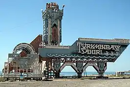 In recent years, the city has undergone large-scale reconstruction: historic district, entrance roads, vital infrastructure.[11] A new Turkish Park and the cascade of fountains.[12] By the end of 2012 Magtymguly Avenue had been completely renovated. The new route merged with the city's waterfront, Bahry Hazar, and from the west motorway junction at Balykçy Traffic Circle a dual carriageway leads westward out of the city along a dike across Soymonov Bay to Turkmenbashy Airport and to Awaza.[13] In 2014, the Oilworkers Palace of Culture, which was built in 1951, was renovated.[14]