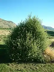 The leaf coverage is compact in kōhūhū; the leaves are arranged alternately on the stem[3] and the petiole is short.[3] The leaves themselves are usually small – 2–4 cm long by 1–2 cm wide – but can grow up to 7 cm long.[3] The edges are undulated and the leaf shape can range from oval to almost circular.[4] Young leaves are covered in a layer of fine hairs that gets shed as the leaves grow.[3] Adult leaves have a smooth, glossy texture.[5] The colouration of the foliage is a silvery green,[4] darker on the upper side and lighter underneath.[5] The midrib of the leaf and its smaller lateral veins are whiteish and quite visible on the upper side of the leaf.[3]