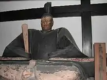 Tokugawa Ieyasu and all the fifteen Ashikaga shōguns are enshrined in a small building called Reikō-den (霊光殿).[2][4] The sixteen statues, which are of limited artistic value, are lined up in two rows on the sides of the room, each sitting and carrying a shaku symbolizing their shogunal power.[2] Their sculptors are unknown, but they have been tentatively dated to the early seventeenth century.[2] The presence among the Ashikaga shōguns of a statue of Tokugawa Ieyasu, founder of the Tokugawa shogunate, suggests that Tokugawa wished to link himself to the Ashikaga clan and give an impression of continuity between the two dynasties.[5] Like them, Ieyasu claimed to be a descendant of the Minamoto clan.