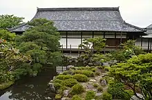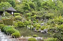 Tōji-in was founded at the foot of Mount Kinugasa in 1341 by Takauji himself in fulfillment of a vow.[2] He did so under the guidance of famous Zen teacher, calligraphist, poet and garden designer Musō Soseki, who created the Zen gardens and ponds of the temple.[1] Tōji-in later became the Ashikaga dynasty's funeral temple and all fifteen of the Ashikaga shōguns are buried here.[1][3] The temple's name was later chosen as one of Takauji's two posthumous names, Tōji-inden (等持院殿).[1] (The other is Chōju-inden, from the name of Takauji's second bodaiji. See footnote.) Tōji-in was number one of the Kyoto Jissetsu, the temples immediately below the Kyoto Gozan within the Five Mountain System nationwide network of Zen temples.[1]