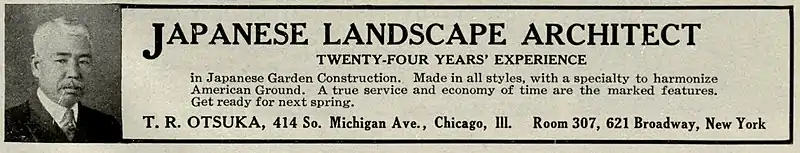 - 1 2 "T.R. Otsuka, the well-known landscape gardener of 300 South Michigan Avenue...". American Florist. June 3, 1916. p. 1046 https://babel.hathitrust.org/cgi/pt?id=nyp.33433007700358&view=1up&seq=1126&skin=2021