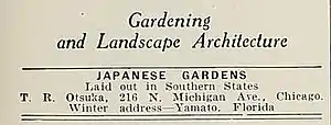 - ↑ advertisement for T. R. Otsuka, House & Garden, January 1923 "Winter address – Yamato, Florida"